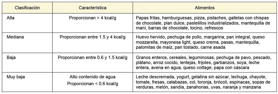 La densidad energética (DE) es la cantidad de calorías o energía por gramo de cada alimento.16 Para calcular la DE de un alimento es necesario conocer el gramaje del alimento y la cantidad de calorías que este aporta; posteriormente se divide la cantidad de calorías entre los gramos del alimento y el resultado nos revela cuántas calorías nos aporta un gramo de alimento. Los pacientes con DM se ven beneficiados al implementar una dieta que incluya alimentos con baja y muy baja DE, hacer de tres a cinco tiempos de comida al día y evitar los periodos de ayuno prolongados.17 Según su DE, los alimentos se pueden clasificar en cuatro tipos (cuadro V).