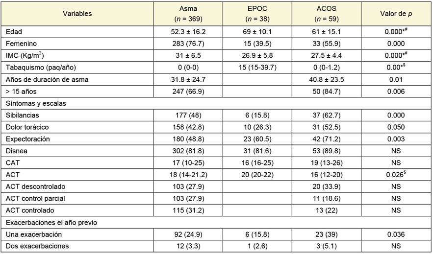 Se analizaron 466 pacientes, de los cuales el 79.3% tuvieron diagnóstico de asma, 8.1% de EPOC y 12.6% de ACOS. La media de edad fue menor en los pacientes con asma (52.3 ± 16.2) comparada con los pacientes con EPOC y ACOS (p < 0.000); la distribución de mujeres fue mayor en los casos de asma (p < 0.000), menor en el grupo de EPOC y muy similar con respecto a los masculinos en el grupo ACOS. El índice tabáquico fue mayor en los pacientes con EPOC con respecto a los otros dos grupos de estudio (mediana: 15; IIC: 15-39.2, p < 0.000) (cuadro I).