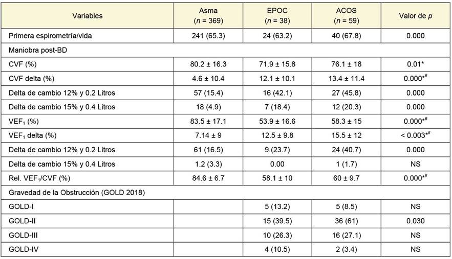 En las maniobras posbroncodilatador, los pacientes con asma experimentaron normalización CVF y el VEF1 a diferencia de los otros dos grupos con EPOC y ACOS, sin embargo, la magnitud del cambio en litros y porcentaje del predicho fue mayor en los pacientes con ACOS al compararse con los pacientes con asma (p = 0.000). Por otra parte, la frecuencia de pacientes con delta de cambio de CVF > 12% y 0.2 L y 15% y 0.4 L fue mayor en los pacientes con ACOS con respecto a los pacientes con asma, sin embargo, este fenómeno solo se observó en los asmáticos en lo respectivo al delta de VEF1 > 12% y 0.2 L (p = 0.000) (cuadro II).