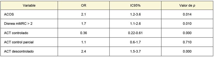 OR: Razón de momios; ACOS: Síndrome de sobreposición asma-EPOC; mMRC: Escala de disnea del consejo de investigación médica; ACT: Cuestionario de control de asma