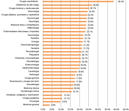 El hospital otorgó 592 160 citas médicas (295 970 en el 2014 y 296 190 en el 2015) habiéndose realizado 479 674 atenciones médicas (238 116 en el 2014 y 241 558 en el 2015). El promedio de edad de los participantes fue 51.1 ± 23.2 y el 59.6% fueron mujeres. La prevalencia de DECE fue del 20.2%, siendo el servicio de medicina general el de más baja prevalencia de DECE con 3.8%, y el servicio de cirugía maxilofacial el de más alta prevalencia de DECE con 38.4% (figura 1).
