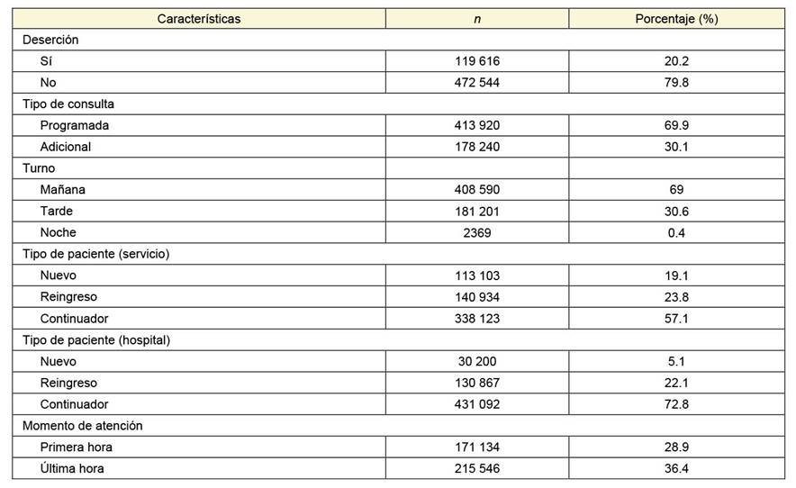 El 30.1% de las citas fueron adicionales, el 69% fueron citas en el turno de mañana, el 57.1% de los pacientes eran continuadores en consulta externa, el 92.7% de las citas tuvieron un diferimiento mayor a 15 días y el 74.7% de los pacientes fueron atendidos en horas ordinarias. Las características de la población de estudio y de las citas se describen en el cuadro I.