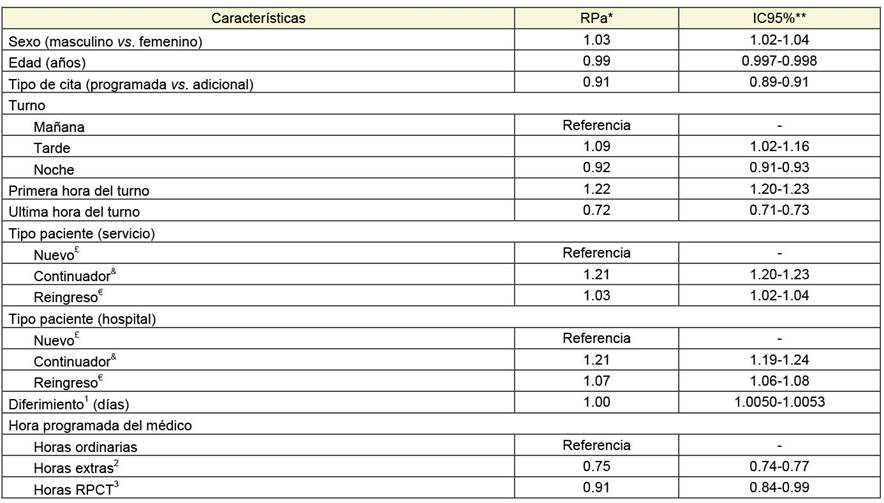 En contraste, la probabilidad de DECE disminuyó en 9% si se trataba de una cita adicional (RPa = 0.91; IC95%: 0.89-0.91), un 8% si la cita era en turno noche comparado con el turno de la mañana (RPa = 0.92; IC95%: 0.91-0.93), un 28% si era la última hora del turno, comparada con la segunda a tercera hora del turno (RPa = 0.72; IC95%: 0.71-0.73), un 25% si eran horas extras (RPa = 0.75; IC95%: 0.74-0.77) y 9% si fueron horas RPCT (RPa = 0.91; IC95%: 0.84-0.99) comparado con las horas ordinarias, respectivamente.