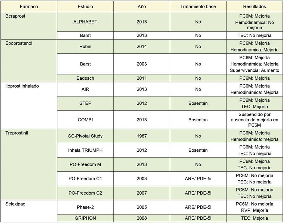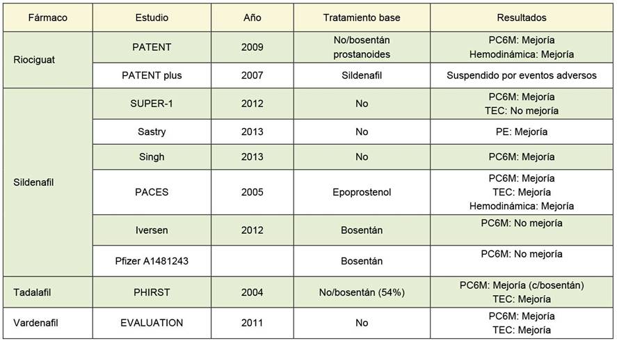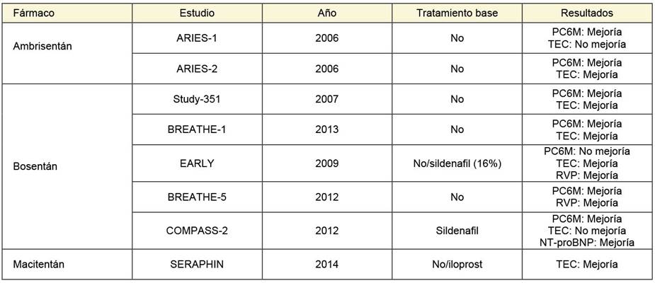 PC6M: Prueba de caminata de 6 minutos; PE: Prueba de esfuerzo; TEC: Tiempo a empeoramiento clínico; RVP: Resistencia vascular pulmonar