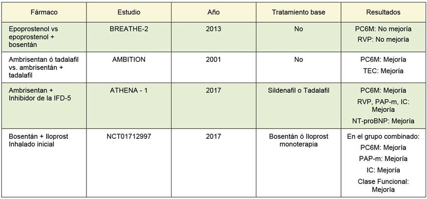Las posibles combinaciones que con frecuencia han sido utilizadas incluyen un fármaco de los grupos ARE e IFD-5 o ARE y sGC; un fármaco IFD-5 puede ser parte también del tratamiento dual o triple, específicamente en presencia de HAP severa. Los diversos fármacos utilizados como monoterapia o tratamiento combinado de las diversas vías de acción se muestran en los cuadros II, III, IV y V.