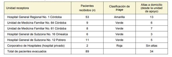 A las 2:00 AM del 19 de marzo del 2019 se percibió un fuerte olor a material plástico quemado y salida de humo en el área de la Consulta Externa; al acudir los trabajadores, observaron la presencia de fuego y se activó el protocolo de respuesta hospitalaria. Desde el Centro de Operaciones de Emergencias (COE) se dio la orden de acción a la Brigada Contra Incendios. El COE inició la evaluación de la situación y se instruyó la evacuación, en la que se dio prioridad a las áreas cercanas al sitio de origen del conato; se solicitó apoyo al personal de bomberos, quienes acudieron en un lapso de 15 minutos y lograron extinguir el incendio. De forma inicial se evacuaron Urgencias, Quirófanos y Cirugía Ambulatoria, esto derivado de las filtraciones y anegaciones secundarias al hacer uso de hidrantes. A continuación se evacuaron las áreas en el nivel superior al sitio del siniestro por la gran cantidad de humo despedido; después se consideró pertinente evacuar por completo el segundo y tercer piso. Una vez ubicados los pacientes en la zona de seguridad externa, se realizó la evaluación de triage con la finalidad de determinar la unidad médica de apoyo adecuada a las necesidades de atención de los pacientes. Al momento del conato de incendio, se contaba con una ocupación del 80%. Se evacuaron un total de 89 pacientes. El resultado del triage arrojó dos pacientes código rojo (2%, el cual requería apoyo mecánico ventilatorio), quienes fueron trasladados inmediatamente a un hospital privado; 53 código amarillo (60%) y 34 código verde (38%). Los últimos dos grupos permanecieron en la zona de seguridad externa para su movilización posterior a unidades de apoyo del mismo IMSS, todo bajo la gestión y supervisión del personal directivo (cuadro I). Para el traslado de los pacientes participaron ambulancias de Cruz Roja Mexicana, Cruz Ámbar, Protección Civil y de servicio privado. No hubo defunciones derivadas de la evacuación.