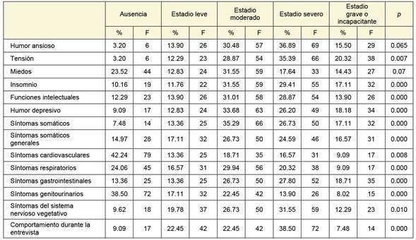 Para determinar la presencia, el número y la intensidad de síntomas relacionados con ansiedad, se utilizó la Escala para ansiedad generalizada de Hamilton, que consta de 14 ítems. La finalidad de la tarea fue explorar la presencia de síntomas y signos que se presentaban en los diferentes aparatos y sistemas. Cada ítem ofrecía cinco opciones de respuesta: 0 que fue considerado como ausencia de síntomas compatibles con ansiedad; 1 sintomatología leve; 2 sintomatología moderada; 3 sintomatología severa, y 4 sintomatología grave o incapacitante. La suma de cada una de las respuestas arrojó el nivel de ansiedad que pudiera estar padeciendo el participante.