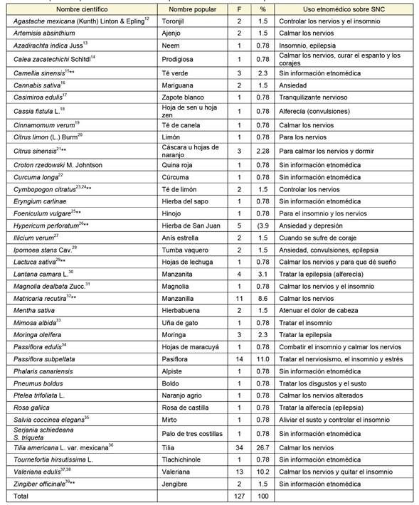 La ansiedad es considerada un padecimiento por el que se recurre manera importante al uso de plantas medicinales.43 A partir del presente estudio, se pone de manifiesto que dicha práctica es importante, aun en los pacientes que desconocen que sus malestares están relacionados con una enfermedad mental. También se evidenció que se preserva el conocimiento médico tradicional de las especies medicinales, toda vez que se detectó que el 82% (32) de los participantes refirieron haber utilizado plantas medicinales para mejorar sus síntomas. Es importante mencionar que un alto porcentaje de las plantas que los pacientes mencionaron en el estudio tienen antecedentes de reportes etnomédicos de uso en trastornos mentales en la medicina tradicional mexicana.