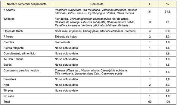 F: frecuencia; SNC: sistema nervioso centralEntre el número de participantes que respondió de manera afirmativa sobre el uso de plantas medicinales como tratamiento de sus síntomas, se identificó que una proporción considerable, 32.6% (60), había hecho uso de productos etiquetados como complementos de la alimentación (cuadro III). Para conocer el contenido de estos productos, se acudió a negocios en los que se pueden adquirir.