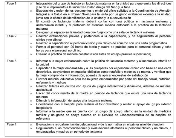 Las recomendaciones y consideraciones específicas del IMSS que han sido adaptadas de los requerimientos de la OMS y la UNICEF se muestran desglosadas por fases en el cuadro ll. En la Delegación Estatal de Puebla del IMSS se comenzó a implementar la iniciativa en el presente año y actualmente se encuentran nominadas las UMF No. 9, No. 22 y próximamente también la No. 30. La UMF No. 22 se nominó en marzo de 2019, y la UMF No. 9 en noviembre de 2019.