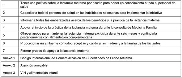 El IMSS se unió al esfuerzo mundial de promover la lactancia materna adaptando los 10 pasos y tres anexos en sus unidades hospitalarias, y en las unidades de medicina familiar los siete pasos (cuadro IIl) y tres anexos. Es importante mencionar que, aunque el programa instituido por la OMS/UNICEF engloba de manera específica y detallada cómo debe realizarse paso a paso el proceso de la práctica de la lactancia materna, este se adapta a la demografía del lugar, así como a las necesidades específicas de la población.36 Por este motivo, para que una institución o unidad médica perteneciente al IMSS en México pueda nominarse en la Iniciativa Unidad Amiga del Niño y la Niña, debe cumplir con todas las fases estipuladas en este artículo.