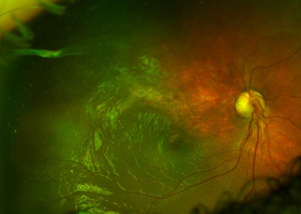 La valoración oftalmológica reportó rechazo a la luz en ojo derecho, sin fijación ni seguimiento de objetos, nistagmo y exotropía de 45º K; en retina se presentaron zonas de atrofia coriorretiniana de predominio macular superior y peripapilar así como atrofia del nervio óptico (figura 1); en el ojo izquierdo también presentaba rechazo a la luz, sin fijación ni seguimiento de objetos, nistagmo, iris con corectopia, retina con atrofia coriorretiniana severa y cicatriz macular de dos diámetros de disco y de forma oval, así como una aplasia total del nervio óptico (figura 2).