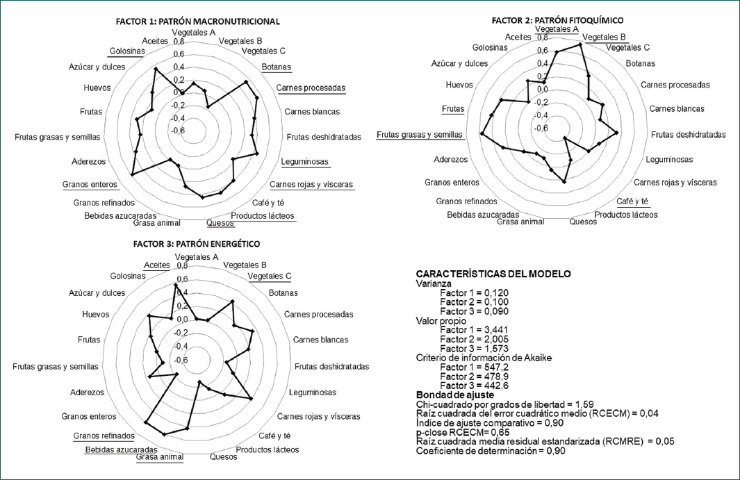 El factor 1 mostró altas cargas factoriales para carnes procesadas, leguminosas, lácteos, quesos, granos enteros, botanas y golosinas. Este factor fue nombrado como patrón macronutricional (PM) y explicó el 12% de la varianza. El factor 2, definido como patrón fitoquímico (PF), mostró altas cargas factoriales para vegetales de los tipos A y B, frutas, frutas grasas y semillas, y carga factorial negativa para café y té, y explicó el 10% de la varianza. El factor 3 constituyó el patrón energético (PE) y explicó el 9% de la varianza, con altas cargas factoriales para vegetales tipo C, granos refinados, bebidas azucaradas, grasa animal y aceites vegetales.