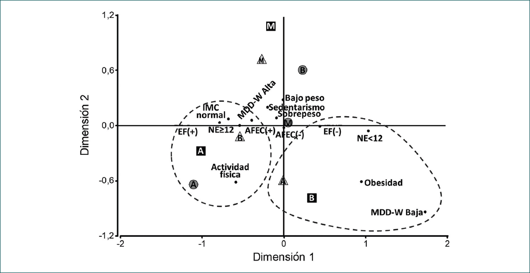 Teniendo en cuenta las relaciones antes descritas, las variables con asociaciones significativas con los patrones alimentarios fueron incluidas en el análisis de correspondencias múltiples ( Fig. 2 ). La primera dimensión explicó el 14% de la variabilidad, y las categorías se distribuyeron principalmente a lo largo de este eje. La segunda dimensión explicó un 10% de la variabilidad de los datos. Un primer agrupamiento fue integrado por alta adherencia al PM, alta adherencia al PF, baja adherencia al PE, empleo formal, ≥ 12 años de educación, MDD-W alta, IMC normal, realizar actividad física y tener antecedentes familiares de enfermedades cardiometabólicas. Un segundo agrupamiento fue integrado por alta adherencia al PE, baja adherencia al PF, MDD-W baja, < 12 años de educación, empleo informal o desempleo, adherencia media al PM y obesidad ( Fig. 2 ).