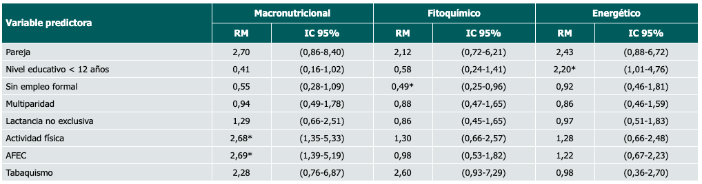 Las estrategias alimentarias dirigidas a intervenir sobre grupos poblacionales específicos, como las mujeres lactantes, deben estar sustentadas por la evidencia científica. Por lo tanto, debido a la complejidad y la multidimensionalidad de la dieta, la epidemiología nutricional recomienda metodologías de análisis multivariantes para evaluar la ingesta alimentaria. Entre las técnicas estadísticas más utilizadas se encuentra la identificación de patrones alimentarios mediante el análisis factorial. Este análisis contribuye al estudio de las relaciones entre la dieta y la salud, superando las limitaciones de los enfoques con alimentos aislados, ya que evalúa todos los componentes de la dieta simultáneamente.6 Ésta técnica estadística representa las relaciones de un conjunto de variables (alimentos), las cuales son explicadas mediante variables latentes llamadas factores (patrones).7 Luego, se predice un puntaje de adherencia a cada patrón para cada sujeto de acuerdo con su ingesta reportada.8 El cálculo de los grados de adherencia permite realizar estimaciones respecto a la ingesta de nutrientes y sus efectos en la salud, teniendo en consideración distintos factores condicionantes, tales como la edad materna, su nivel educativo, empleo, estado civil, nacionalidad, estado nutricional y antecedentes reproductivos.9,10