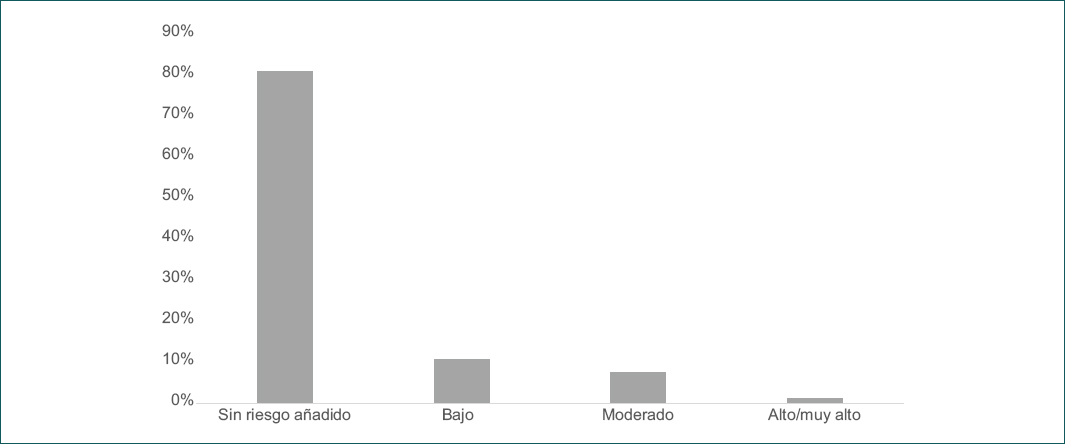 El 11.8% de los sujetos tenía diagnóstico previo de HTA. Al momento de la encuesta, el 81% registró cifras de presión arterial en la categoría de normal, el 11.8% en la categoría de presión arterial normal-alta y el 7.2% en la categoría de HTA de grado 1; ninguno tuvo HTA de grado 2 o 3. El 19% presentó un RCV bajo, moderado o alto (Fig. 1).