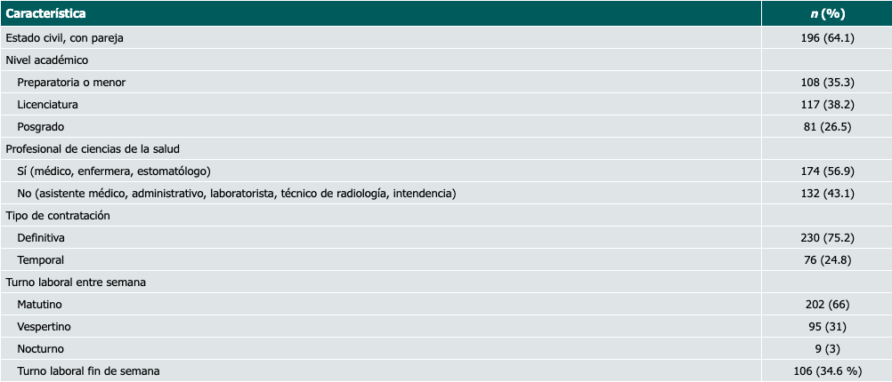 El promedio de edad fue de 38.0 ± 10.2 años (mínimo 19, máximo 63) y el de antigüedad laboral fue de 11.1 ± 9.1 años (mínimo 0, máximo 33). Predominaron el estado civil con pareja, el profesional de las ciencias de la salud, el tipo de contratación definitiva y el turno de trabajo matutino (Cuadro II).