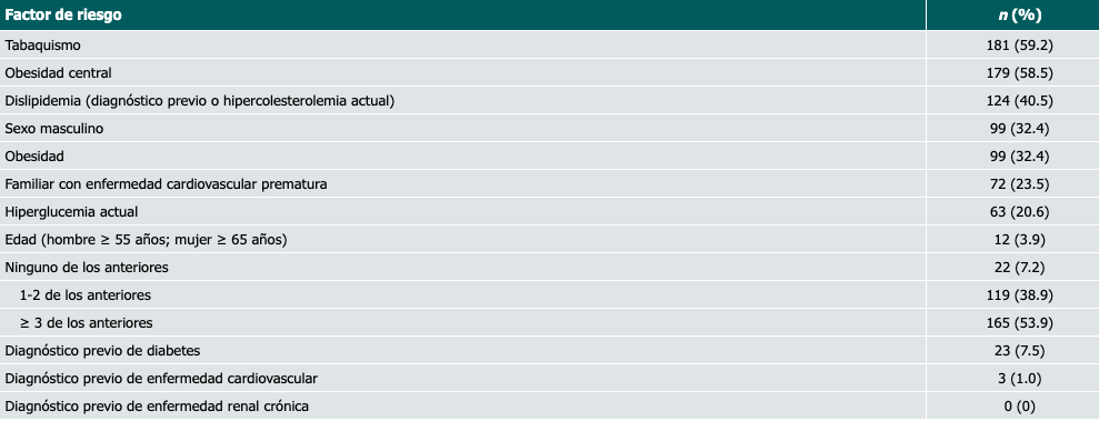 Media de índice de masa corporal: 28.2 kg/m2 ± 5.3 kg/m2; circunferencia abdominal: 93.8 cm ± 14.5 cm; presión arterial sistólica: 113.7 ± 12.7 mmHg; presión arterial diastólica: 73.1 ± 8.5 mmHg; glucosa capilar en ayuno: 91.7 ± 11.5 mg/dl; colesterol capilar en ayuno: 177.2 ± 34.7 mg/dl. Los factores de riesgo más prevalentes fueron el tabaquismo, la obesidad central y la dislipidemia (Cuadro III).