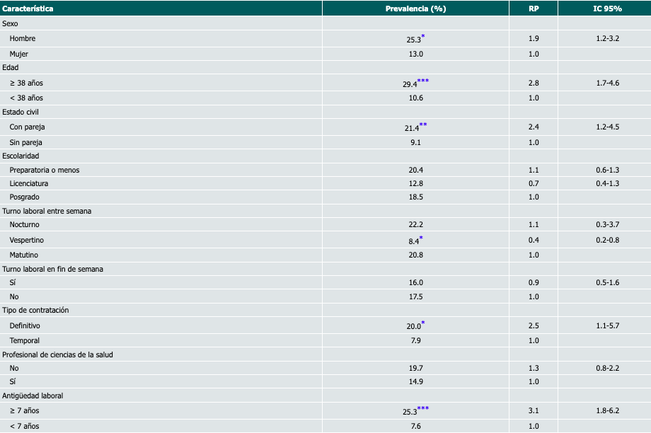 Las razones de prevalencia y las pruebas de diferencia de proporciones mostraron una mayor frecuencia de RCV para el sexo masculino (p < 0.05), la edad ≥ 38 años (p < 0.001), el estado civil con pareja (p < 0.01), la contratación definitiva (p < 0.05) y la antigüedad ≥ 7 años (. < 0.001), y una menor frecuencia de RCV en el turno vespertino (p < 0.05) (Cuadro IV).