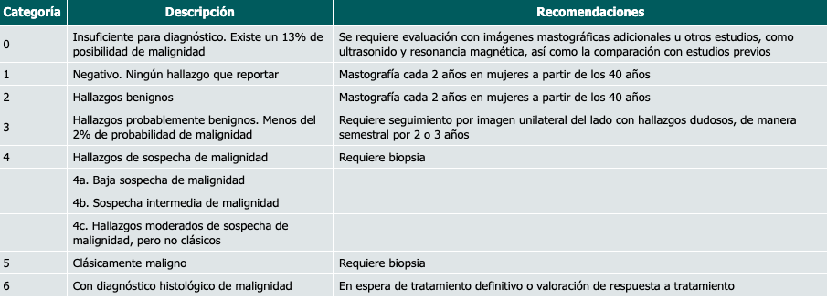 El método de cribado debe reducir la tasa de muerte por cáncer. El sistema BI-RADS (BreastImaging-Reporting and Data System) es el utilizado en unidades de primer nivel, como la Unidad de Medicina Familiar No. 13 (UMF No. 13), y consta de siete estadios (0-6), siendo el estadio 0 un resultado no concluyente y el 6 una muestra con estudio positivo a malignidad por biopsia. El estudio de mamografía reportado como BI-RADS 0 debe ser considerado como sospechoso de malignidad, incluso por encima de aquellos BI-RADS 3 y 4, debido a la incertidumbre en el resultado y a la posibilidad de perder contacto con la paciente.