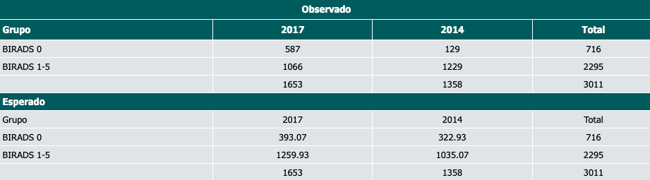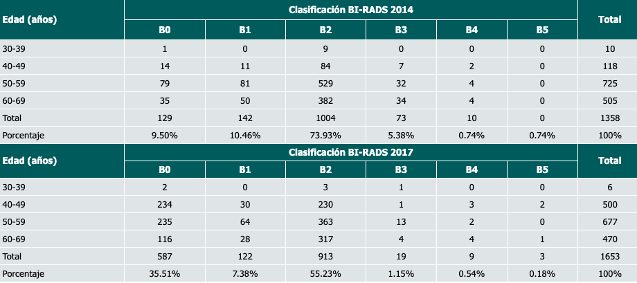 Resultados: En 2014, el 9.5% de las pacientes estudiadas obtuvieron un resultado BI-RADS 0, mientras que en el año 2017 fueron el 35.4%, con un valor de ji al cuadrado de 278.31, con lo que se demuestra una probabilidad mayor del 99% de que exista una asociación entre el año en que se realizó el estudio y el número de BI-RADS 0 reportado.
