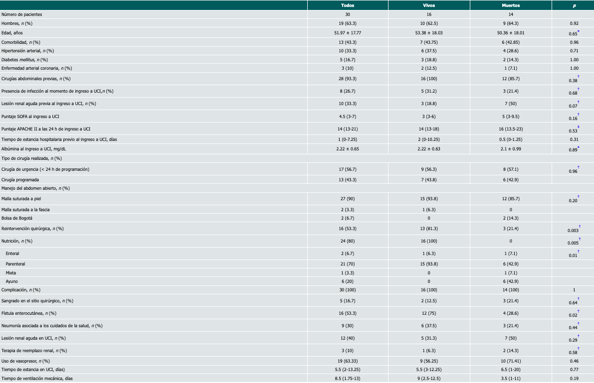 En el 56.7% (n = 17) de los pacientes el procedimiento quirúrgico fue de emergencia, mientras que en el 43.3% (n = 13) se realizó de forma programada. Los tipos de técnica quirúrgica de abdomen abierto utilizados fueron la colocación de malla a piel en el 90% (n = 27), el uso de bolsa de Bogotá en el 6.7% (n = 2) y el uso de malla a la aponeurosis en el 3.3% (n = 1). Fue necesaria la reintervención quirúrgica para la realización de lavado de la cavidad en el 81.3% de los pacientes que egresaron vivos y en el 21.4% de los que murieron en la UCI (p = 0.005).