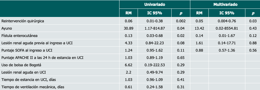 De las variables que mostraron asociación con el riesgo de muerte en la UCI, en el análisis multivariado solo se pudo identificar que las reintervenciones quirúrgicas se asociaron con una disminución en el riesgo de muerte, con una RM de 0.05 (IC 95%: 0.004-0.76). Los resultados completos se muestran en el Cuadro II.