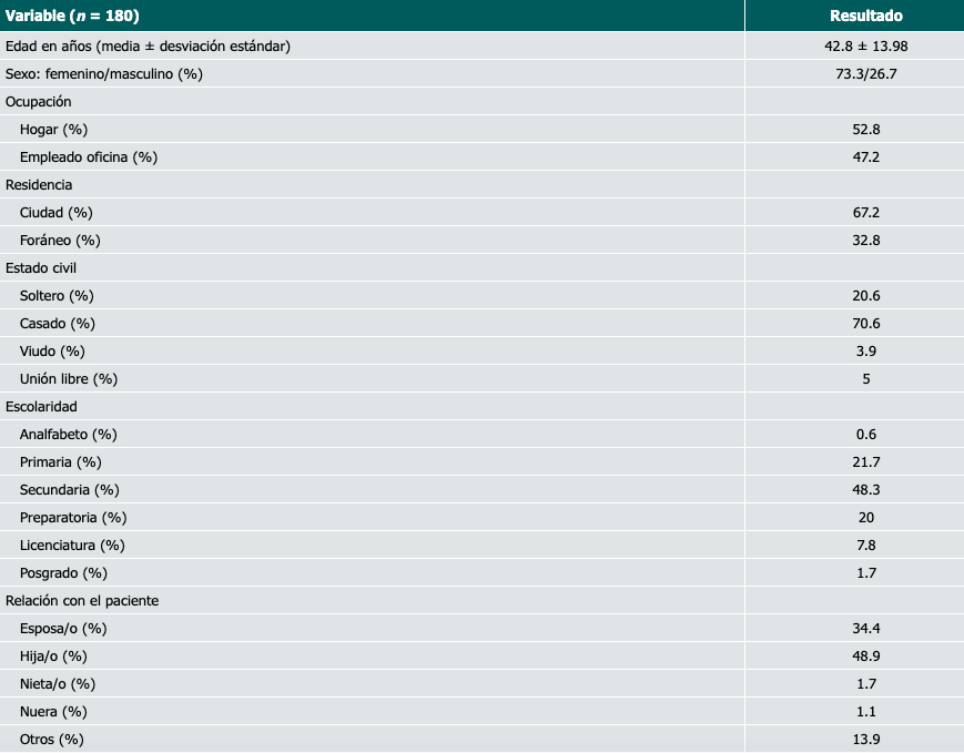 Analizamos 180 cuidadores primarios informales, con una edad promedio de 42.86 ± 13.9 años, el 73% eran mujeres (principalmente hijas y esposas), el 88.3% de religión católica y el 21.7% con nivel educativo básico; el resto de las variables se muestran en el Cuadro I.
