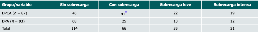 El índice de Barthel reportó total independencia en el 89.4%, dependencia leve en el 7.2% y dependencia moderada en el 3.3% de los pacientes. De los 19 pacientes con dependencia, 12 eran del grupo sin sobrecarga, 3 del grupo de sobrecarga leve y 4 del grupo de sobrecarga moderada (p = 0.98).