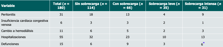 A los 12 meses de seguimiento se registraron 55 hospitalizaciones de pacientes, de los cuales se identificó que 23 se encontraban en el grupo cuyo cuidador presentaba sobrecarga (10 leve y 13 intensa), sin significancia estadística. Las principales causas de hospitalización fueron peritonitis, insuficiencia cardiaca congestiva venosa, cirugía electiva o de urgencia, y sangrado del tubo digestivo alto, entre otras (Cuadro IV). De los 31 pacientes con peritonitis, 19 se encontraban en DPA y 12 en DPCA (p = 0.03); además, de las 31 peritonitis, 13 fueron en pacientes cuyo cuidador presentaba algún grado de sobrecarga.