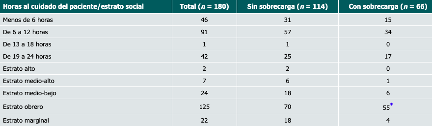 El promedio de horas al día al cuidado del paciente fue de 11.7 ± 7.3, siendo para el grupo sin sobrecarga de 11.3 ± 7.3 horas, para el de sobrecarga leve de 11.8 ± 7.6 horas y para el de sobrecarga intensa 12.9 ± 7.1, sin diferencia estadística (Cuadro III).