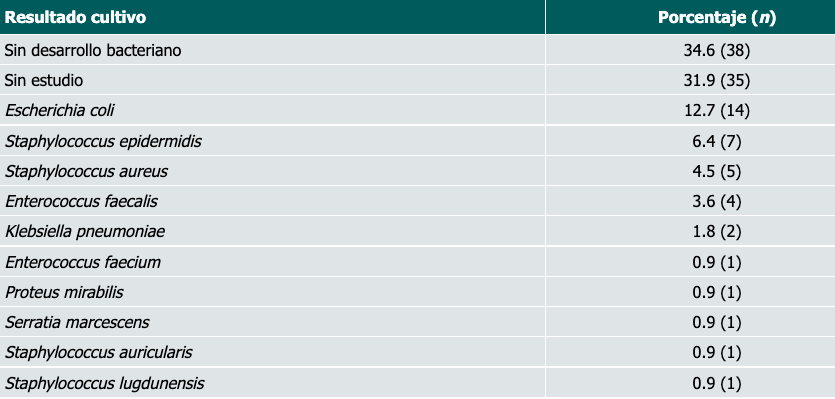 – Los resultados de los cultivos fueron: sin desarrollo bacteriano en el 34.6% (n = 38), sin estudio en el 31.9% (n = 35), Escherichia coli en el 12.7% (n = 14), Staphylococcus epidermidis en el 6.4% (n = 7), Staphylococcus aureus en el 4.5% (n = 5), Enterococcus faecalis en el 3.6% (n = 4), Klebsiella pneumoniae en el 1.8% (n = 2), y Enterococcus faecium, Proteus mirabilis, Serratia marcescens, Staphylococcus auricularis y Staphylococcus lugdunensis en el 0.9% (n = 1) cada uno (Cuadro II).