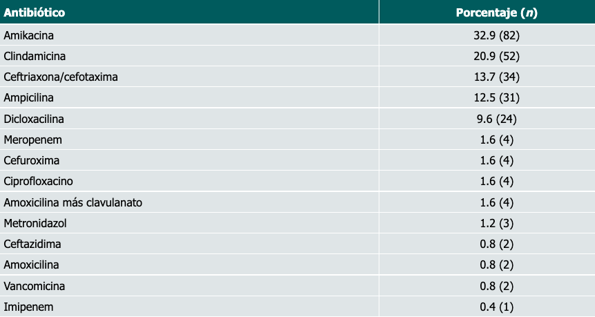 – El antibiótico administrado fue amikacina en el 32.9% (n = 82), clindamicina en el 20.9% (n = 52), ceftriaxona-cefotaxima en el 13.7% (n = 34), ampicilina en el 12.5% (n = 31), dicloxacilina en el 9.6% (n = 24), meropenem, cefuroxima, ciprofloxacino y amoxicilina más clavulanato en el 1.6% (n = 4) cada uno, metronidazol en el 1.2% (n = 3), ceftazidima, amoxicilina y vancomicina en el 0.8% (n = 2) cada uno, e imipenem en el 0.4% (n = 1) (cuadro VI).