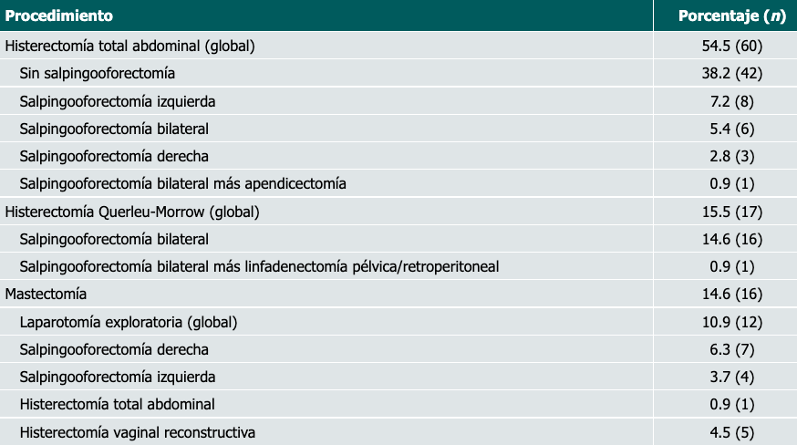 – Los procedimientos realizados fueron histerectomía total abdominal en el 54.5% (n = 60), realizándose sin salpingooforectomía en el 38.2% (n = 42), con salpingooforectomía izquierda en el 7.2% (n = 8), con salpingooforectomía bilateral en el 5.4% (n = 6), con salpingooforectomía derecha en el 2.8% (n = 3) y con salpingooforectomía bilateral más apendicectomía en el 0.9% (n = 1); histerectomía Querleu-Morrow en el 15.5% (n = 17), realizándose con salpingooforectomía bilateral en el 14.6% (n = 16) y con salpingooforectomía bilateral más linfadenectomía pélvica/retroperitoneal en el 0.9% (n = 1); mastectomía en el 14.6% (n = 16); laparotomía exploratoria en el 10.9% (n = 12), realizándose con salpingooforectomía derecha en el 6.3% (n = 7), con salpingooforectomía izquierda en el 3.7% (n = 4) y con histerectomía total abdominal en el 0.9% (n = 1); e histerectomía vaginal reconstructiva en el 4.5% (n = 5) (Cuadro I).
