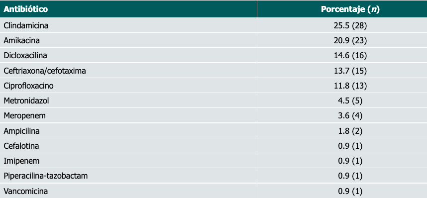– El antibiótico administrado fue clindamicina en el 25.5% (n = 28), amikacina en el 20.9% (n = 23), dicloxacilina en el 14.6% (n = 16), ceftriaxona/cefotaxima en el 13.7% (n = 15), ciprofloxacino en el 11.8% (n = 13), metronidazol en el 4.5% (n = 5), meropenem en el 3.6% (n = 4), ampicilina en el 1.8% (n = 2), y cefalotina, imipenem, piperacilina-tazobactam y vancomicina en el 0.9% (n = 1) cada uno (Cuadro III).