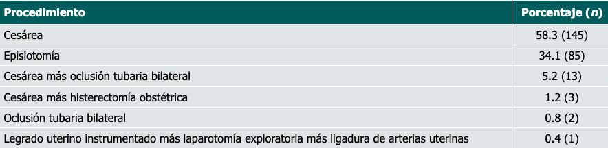 – Los procedimientos realizados fueron cesárea en el 58.3% (n = 145), episiotomía en el 34.1% (n = 85), cesárea más oclusión tubaria bilateral en el 5.2% (n = 13), cesárea más histerectomía obstétrica en el 1.2% (n = 3), oclusión tubaria bilateral en el 0.8% (n = 2) y legrado uterino instrumentado más laparotomía exploratoria más ligadura de arterias uterinas en el 0.8% (n = 1) (Cuadro IV).