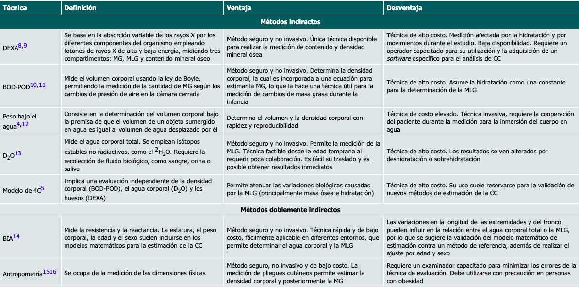 En los estudios comparativos entre métodos indirectos se observa una buena concordancia entre el resultado de DEXA y D2O utilizando el método de 3C y 4C como referencia. La concordancia de la técnica BOD-POD ha mostrado ser baja en la mayoría de los estudios, independientemente del método de referencia utilizado. Considerando los resultados de los estudios incluidos, el uso de DEXA ha mostrado una mejor concordancia. En caso de utilizarse, es importante hacerlo siempre con el mismo equipo, ya que cada fabricante utiliza sus propios algoritmos para la estimación de la CC, por lo que pueden existir diferencias entre las marcas comerciales.56 En caso de utiliza BOD-POD, se sugiere utilizar la ecuación de Siri para la estimación de la GC.
