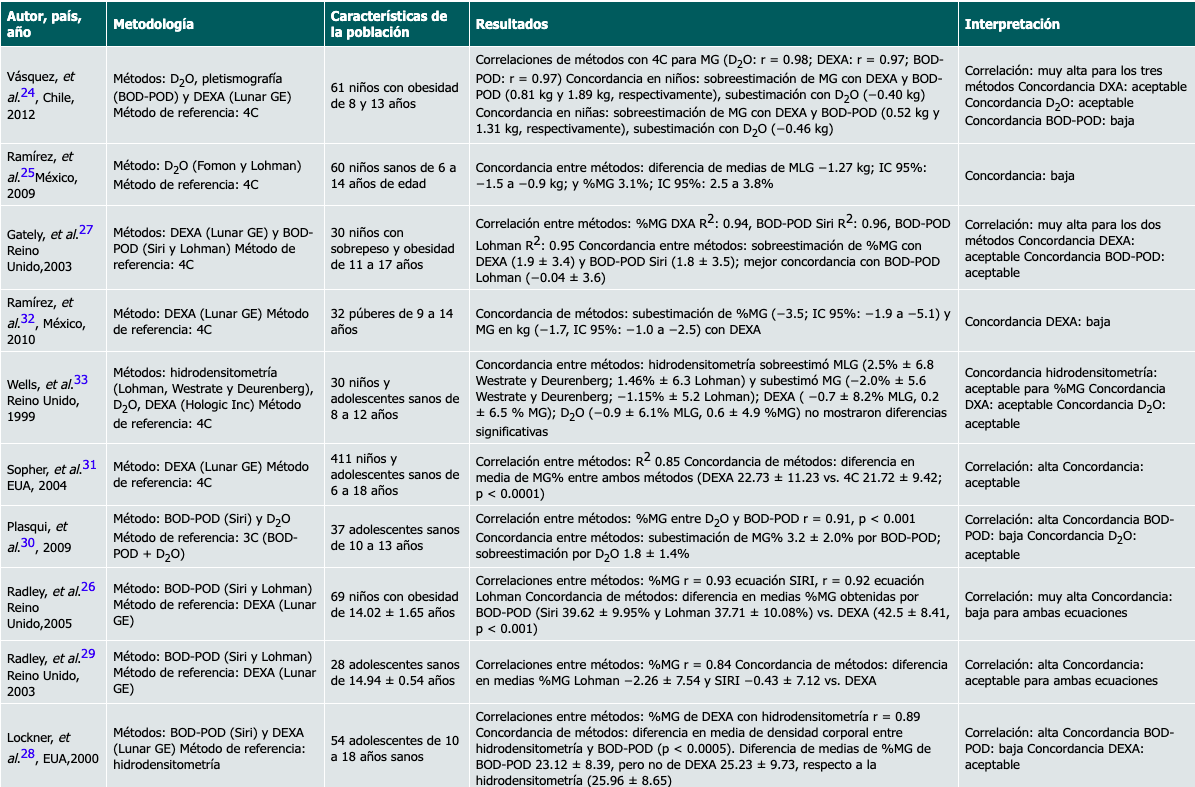 Se realizó una búsqueda no sistemática de la literatura en las bases de datos PubMed, Scielo y Google Scholar para identificar estudios cuyo objetivo primario fuera la evaluación de la concordancia entre dos o más métodos de determinación de la CC. Se utilizaron las siguientes palabras clave: “body composition AND assessment OR technique OR measurement OR methods” AND “adolescents OR teenage OR children” AND “agreement OR correlation”. Se incluyeron los estudios realizados en niños o adolescentes que informaron sobre los resultados de concordancia entre los métodos de CC comparados con un método de referencia, expresados como coeficiente de correlación intraclase, coeficiente de Lin o diferencia de medias con límites de concordancia, o bien los resultados de correlación expresados como correlación de Pearson (r) o coeficiente de determinación (R2).