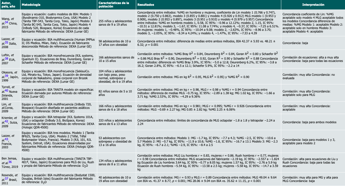 Al comparar BIA tetrapolar y octapolar frente a DEXA en 333 niños y adolescentes sanos, Kriemler, et al.42 reportaron una baja concordancia entre ambos modelos. Lazzer, et al.43 compararon dos equipos de BIA frente a DEXA en 53 adolescentes con sobrepeso y obesidad, y reportaron buena concordancia solo en los resultados de uno de los modelos estudiados.