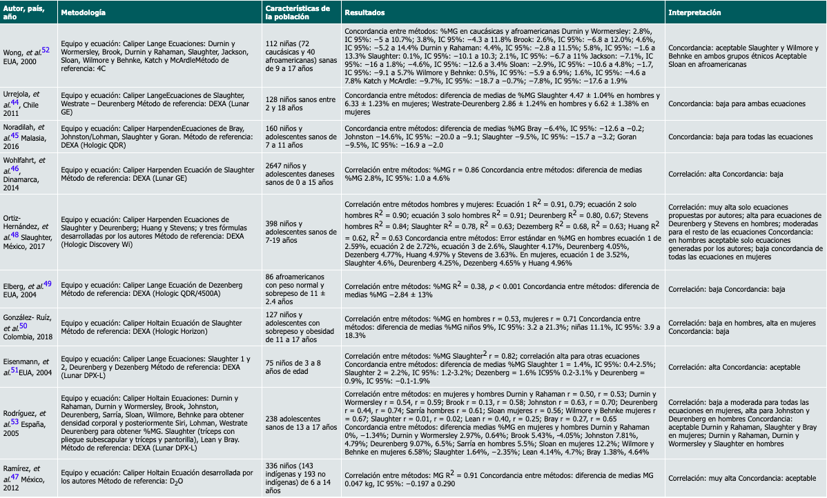 Urrejola, et al.44 compararon dos ecuaciones que incluyen pliegues cutáneos (Slaughter, Westrate y Deurenberg) frente a DEXA en 128 niños y adolescentes sanos, y observaron que todas las ecuaciones tuvieron una baja concordancia con DEXA (5.49 ± 0.82% Slaughter y 4.92 ± 0.98% para Westrate y Deurenberg). De manera similar, Noradilah, et al.45 evaluaron cuatro ecuaciones de antropometría (Bray, Johnston/Lohman, Slaughter y Goran) frente a DEXA, y observaron una baja concordancia con todos los modelos matemáticos. Wohlfahrt-Veje, et al.46compararon la ecuación de Slaughter frente a DEXA en 2647 niños y adolescentes de 0 a 15 años, y hallaron que el %MG presentó una correlación alta con lo obtenido con DEXA (r = 0.86), pero la concordancia fue baja.