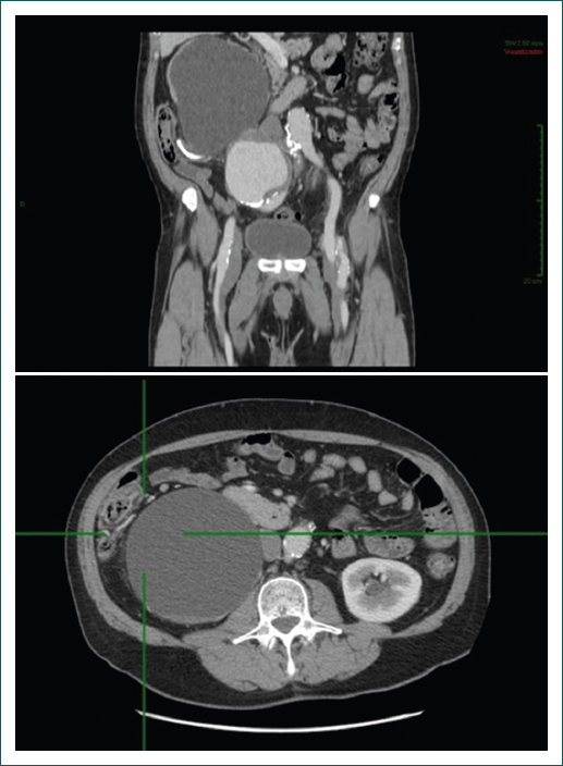 Su padecimiento actual inició 20 días previos a su internamiento, presentando de manera súbita dolor de tipo punzante, intermitente, localizado en la fosa renal derecha, inicialmente de intensidad 4/10 y que aumentó de manera progresiva a 10/10, que irradiaba a la extremidad inferior homolateral, sin exacerbantes ni atenuantes, y acompañado de disuria y polaquiuria. Acudió al urólogo, quien solicitó una tomografía computada contrastada abdominal y pélvica, que evidenció tres aneurismas localizados en las arterias ilíacas común derecha e interna y externa izquierdas, además de quistes renales bilaterales de predominio derecho (Fig. 1).
