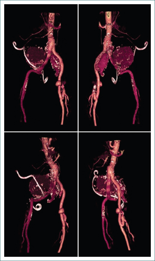 En la exploración física se encontró hipertenso (140/100 mmHg), con dolor abdominal a la palpación media y profunda en hipogastrio y mesogastrio irradiado al miembro pélvico, con sensación de masa pulsátil y soplo en la misma región e irradiado al flanco derecho, hiperalgesia en la región inguinal derecha y con pulsos periféricos de miembros inferiores disminuidos en intensidad, sobre todo del lado derecho. Se le realizó una angiotomografía, la cual corroboró tres aneurismas: uno en la arteria ilíaca común derecha de 10 × 9 cm con trombo mural, y los otros dos en las arterias ilíacas interna y externa izquierdas, de 5 × 5 cm y 3 × 2 cm, respectivamente; además de quistes renales bilaterales de predominio derecho y litiasis renal, lo que explica las manifestaciones urológicas (Fig. 2).
