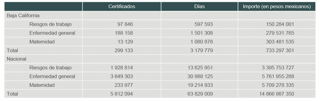 Results: 97,901 certificates of temporary incapacity for work were issued in Baja California with a total amount of 150,284,001 Mexican pesos. 1593 permanent disabilities were granted with an average monthly amount of 3830 pesos and a total of 8982 accumulated years of potential productive life lost. 38 death certificates by work-related risks were issued and accounted for a total of 1048 years of potential productive life lost and 182 491 pesos for funeral expenses.