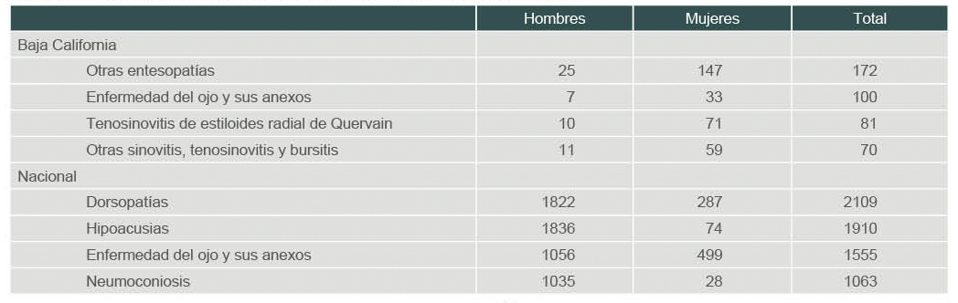 Las dos principales causas a nivel nacional no se observan dentro de los primeros lugares de la Delegación Baja California. Llama la atención que la hipoacusia se reporte dentro de los últimos lugares a nivel delegacional, tal vez debido a un subregistro de las enfermedades de trabajo o a las medidas preventivas y correctivas.24