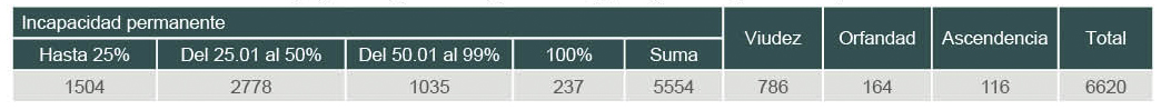 Se otorgaron 1593 incapacidades permanentes, 1195 incapacidades por accidentes de trabajo, 239 por accidentes en trayecto y 159 por enfermedades de trabajo, 75% a hombres y 25% a mujeres, con una cuantía mensual promedio de 3830 pesos, que se suman a las pensiones en curso observadas en el cuadro IV. Las causas más frecuentes fueron la fractura a nivel de la muñeca y de la mano (13.8%), fractura de la pierna, inclusive el tobillo (11.2%), fractura del antebrazo (8%) y amputación traumática de la muñeca y de la mano (7.4%). Se estimaron un total de 8981.71 años acumulados de vida productiva potencial perdidos.