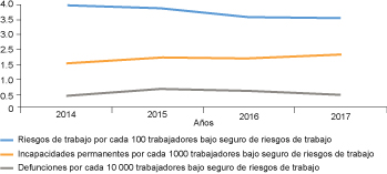 Los costos directos asociados a riesgos de trabajo en el IMSS a nivel nacional fueron de 32 956 millones de pesos mexicanos en el año 2017,18el 0.15% del producto interno bruto total a precios básicos.19Según la OIT, los costos indirectos pueden llegar a ser hasta 20 veces mayores que los costos directos,8 lo que representaría hasta el 3.1% del producto interno bruto. Tomando en cuenta que de los 123.7 millones de personas en el país, solo 36.3% están afiliadas al IMSS, dichas cifras resultan alarmantes.14