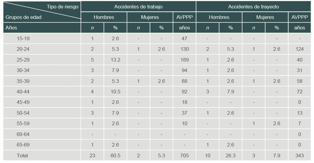 Material and methods: Cross-sectional descriptive study; the information was obtained from IMSS 2017 Statistical Memory and Baja California Local Office database. We analyzed 26,657 cases of work-related accidents and diseases. Years of potential productive life lost were calculated with the years of potential productive life lost indicator and the accumulated years of potential productive life lost indicator.