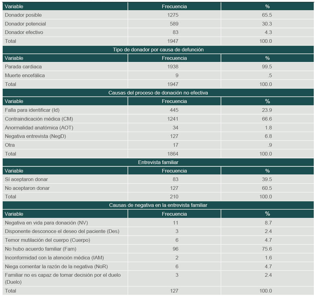 Se registraron un total de 1947 defunciones de las cuales 1275 (65.5%) fueron clasificadas como posibles donadores (defunciones que no cumplen con criterios médicos para donar, las cuales están conformadas por las contraindicaciones médicas y las anormalidades anatómicas), 589 (30.3%) como potenciales donadores (defunciones que cumplen con criterios médicos para donar pero en las que al final no se concretó la donación; están conformadas por las defunciones que fallaron en ser identificadas, entrevistas negativas y otras causas) y 83 (4.3%) como donadores efectivos. Con respecto a los tipos de donadores por causa de defunción se reportaron 1938 (99.5%) defunciones por parada cardiaca y nueve (0.5%) defunciones por muerte encefálica. Se reconocieron un total de 1864 defunciones que resultaron en donación no efectiva y los motivos fueron los siguientes: 1241 (66.6%) presentaron contraindicación médica para el proceso de donación; 445 (23.9%) fallaron en ser identificados; 127 (6.8%) fueron entrevistas negativas a la donación; 34 (1.8%) mostraron anormalidad anatómica, y 17 (0.9%) se debieron a otras causas, como la falta de disponibilidad de un procurador de órganos y tejidos, la ausencia de un disponente secundario y la reclamación del cadáver por parte de la funeraria de forma inmediata. Se efectuaron en total 210 entrevistas, de las cuales 83 (39.5%) disponentes secundarios aceptaron donar y 127 (60.5%) se negaron a hacerlo; dicho de otra manera, en cuatro de cada 10 entrevistas los entrevistados aceptaron donar. Entre las causas de negativa en la entrevista familiar se identificaron las siguientes razones: 96 (75.6%) disponentes secundarios no llegaron a un acuerdo familiar; 11 (8.7%) reportaron negativa en vida para la donación; seis (4.7%) presentaron temor a la mutilación del cuerpo de su familiar; seis (4.7%) se negaron a comentar la razón de la negativa; tres (2.4%) desconocían el deseo de su familiar en vida; tres (2.4%) no fueron capaces de tomar una decisión por duelo, y dos (1.6%) disponentes secundarios estuvieron inconformes con la atención medica que recibió su familiar antes de fallecer (cuadro II).