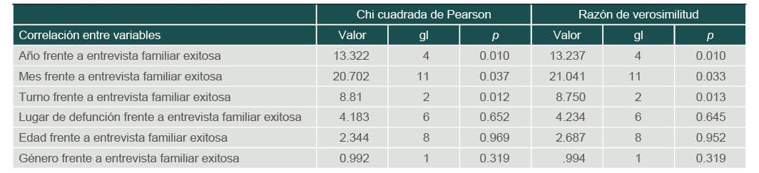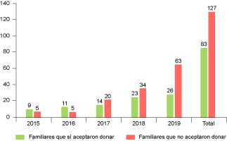 Resultados: se registró un global de 1947 defunciones y se efectuaron en total 210 entrevistas; 83 (39.5%) disponentes secundarios aceptaron donar y 127 (60.5%) se negaron. Solo tres asociaciones entre variables tuvieron valor estadístico significativo. El año fue un determinante importante en el incremento de las donaciones efectivas (p = 0.010) y también lo fue el mes del año (p = 0.037), pues se obtuvieron más entrevistas positivas en el segundo semestre del año; finalmente, el turno también contribuyó en la respuesta familiar (p = 0.012) y fue el turno matutino el mejor para hacer una entrevista familiar exitosa.