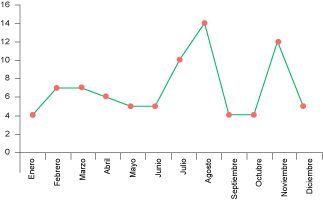 2. Se obtuvieron más entrevistas positivas en el segundo semestre del año (p = 0.037) y los meses de julio, agosto y noviembre fueron los preferibles para la obtención de una entrevista familiar exitosa (figura 2).